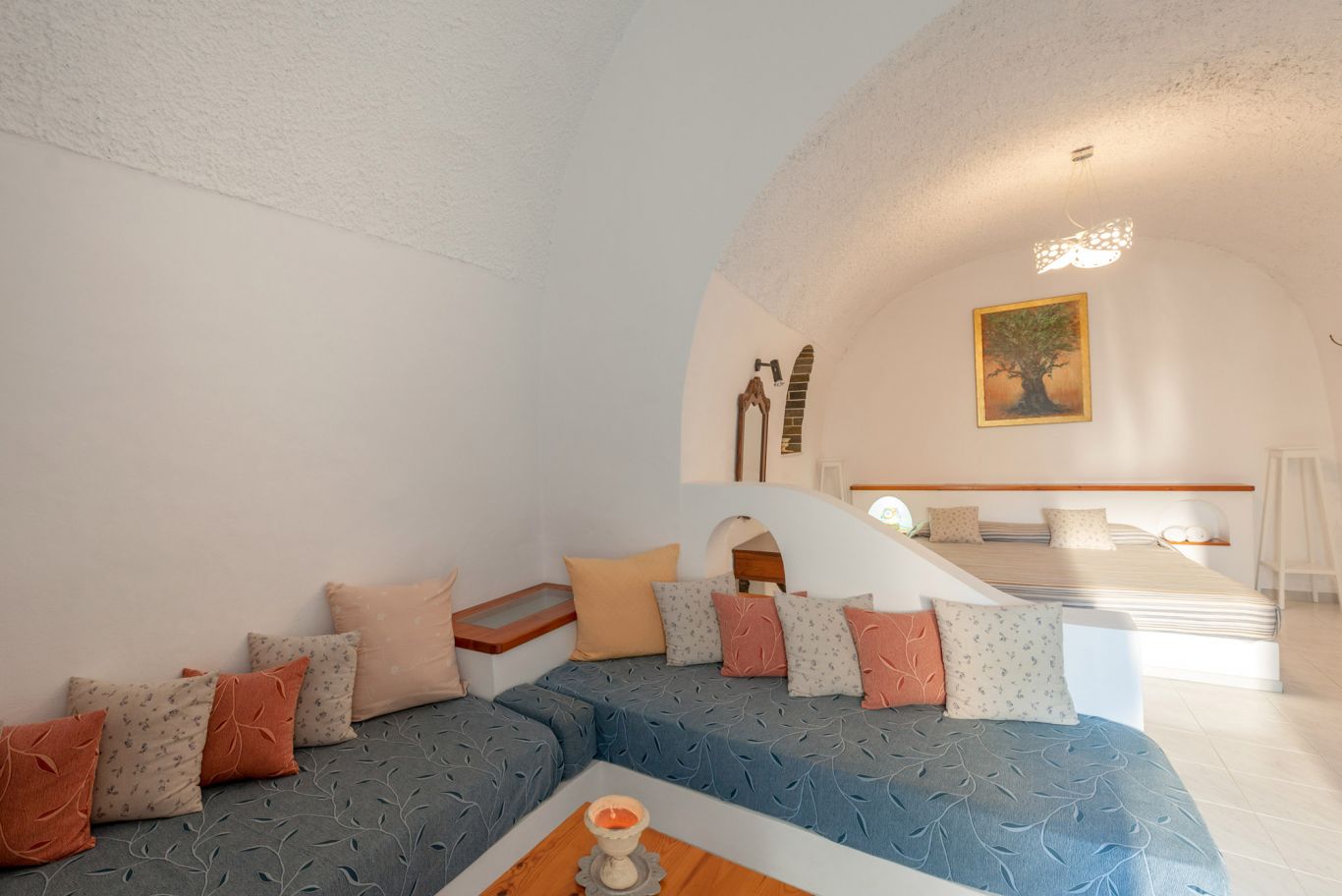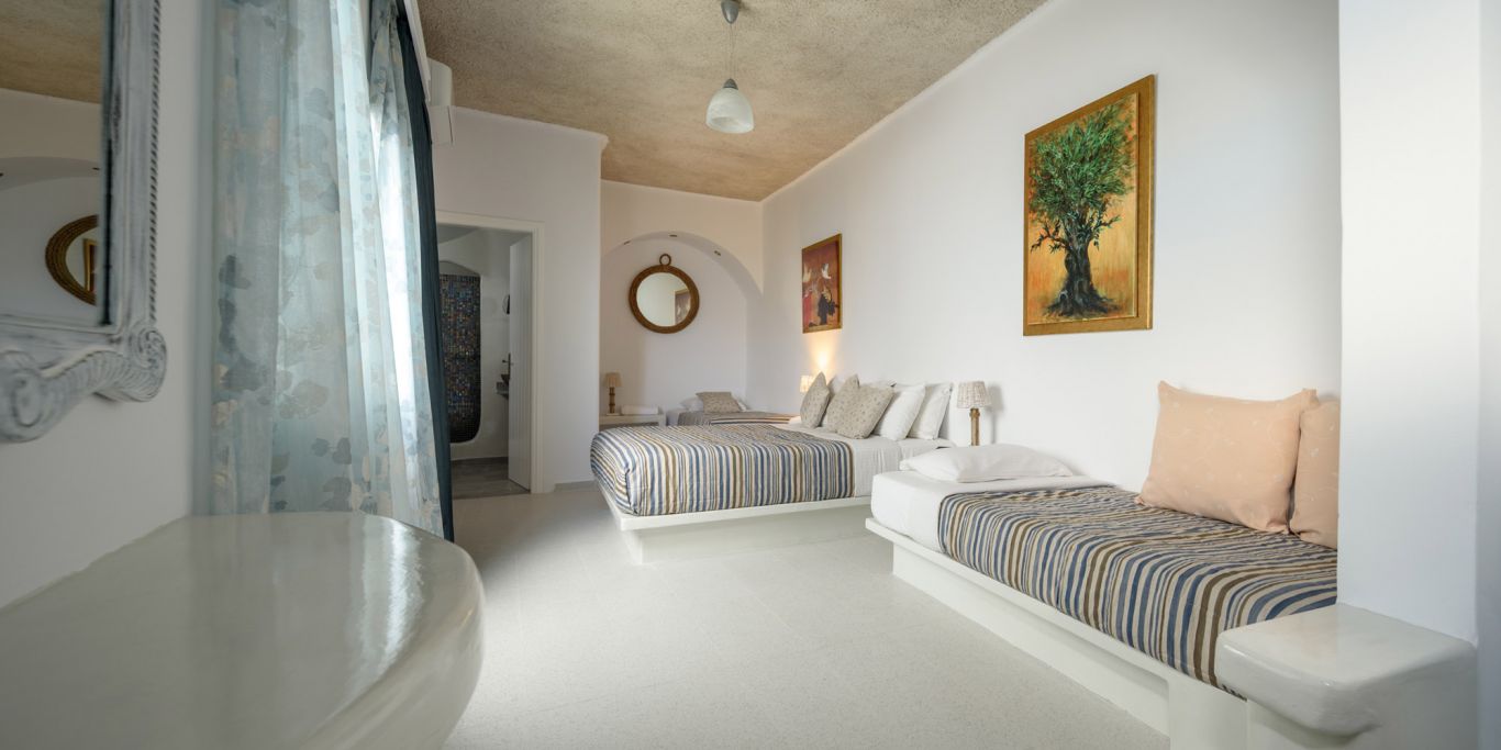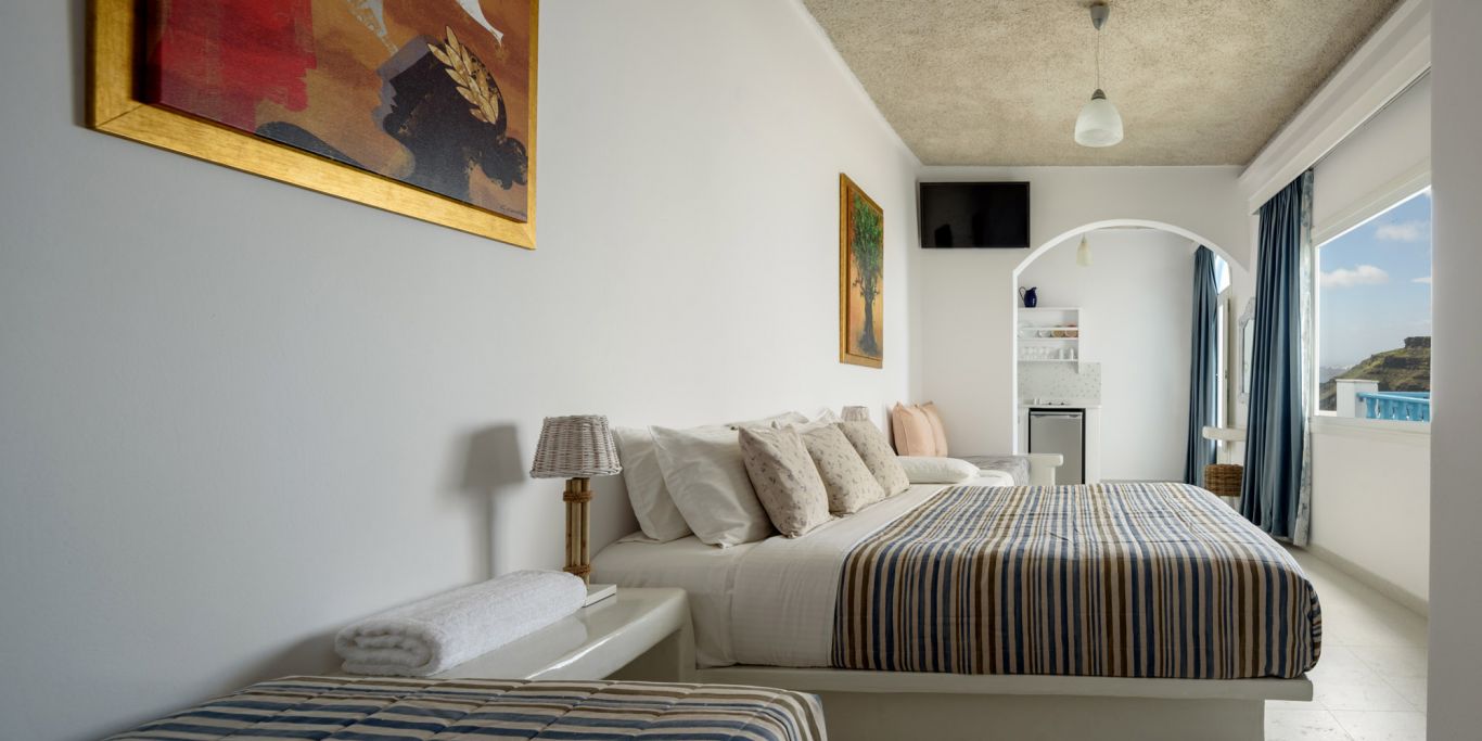 Хотелът предлага кафе-бар с тераса и гледка към калдерата на Санторини.