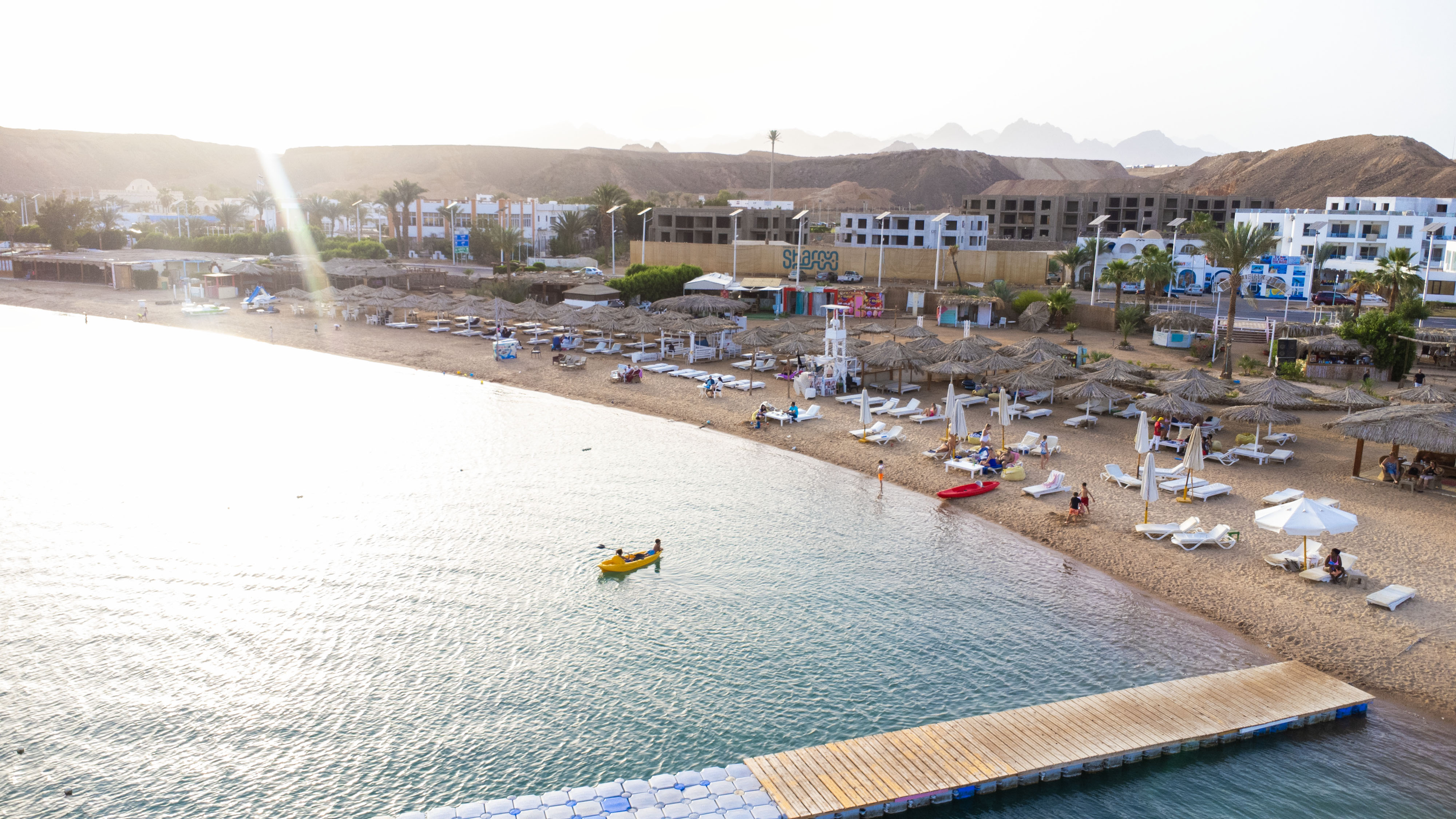 Собствен, пясъчен, достига се с безплатен шатъл (на всеки 15 минути). Шезлонги и чадъри на плажа и при басейна - безплатни.
