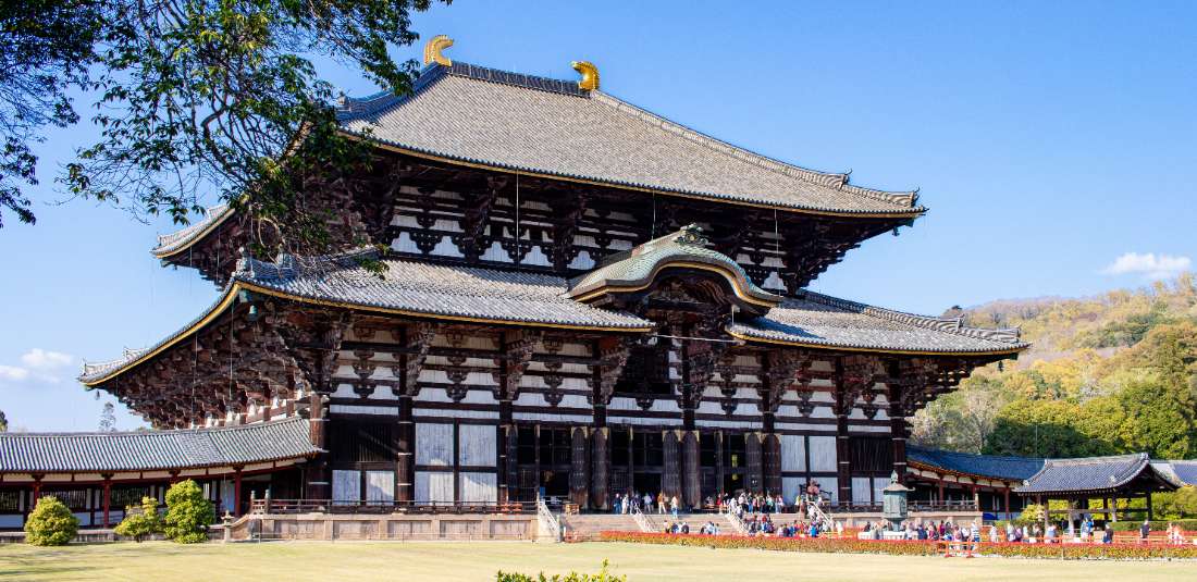 СЕДМИ ДЕН: Закуска. Отпътуване за старата столица Нара (Осака – Нара 30 км). Посещение на будисткия храм Тодайджи – един от седемте най-големи в Япония. Основната сграда е призната за най-голямата дървена конструкция в света и помещава колосалната бронзова статуя на Буда с височина 15 м. Разглеждане на шинтоитското светилище Касуга Таиша, използвано и като семейна гробница на фамилията Фудживара, дала на Япония много регенти и императори през периода Нара. Паметник на ЮНЕСКО, гробницата впечатлява с украсата от многобройни бронзови и каменни фенери. В храмовия комплекс са разпръснати множество по-малки спомагателни светилища, разположени по протежение на пътя покрай главния храм и посветени на дванайсетте бога на късмета. Комплексът e известен и със своя парк с елени, където животните се разхождат на свобода и могат да бъдат наблюдавани. Обяд. Посещение на старата част на Нара. Завръщане в Осака. Разходка из Пазара Куромон – един от централните и добре познати на местните граждани пазари в Осака, където могат да бъдат намерени различни типични за Япония хранителни продукти и стоки. Разходка по популярната търговска улица „Дотонбори”, разположена на брега на едноименния канал. Улицата впечатлява с многобройните си неонови реклами на големи магазини и ресторанти. Разходката продължава по успоредната улица „Шинсайбаши”, където са съсредоточени бутиците и магазините на най-известните марки. Завръщане в хотела. Нощувка в Осака.