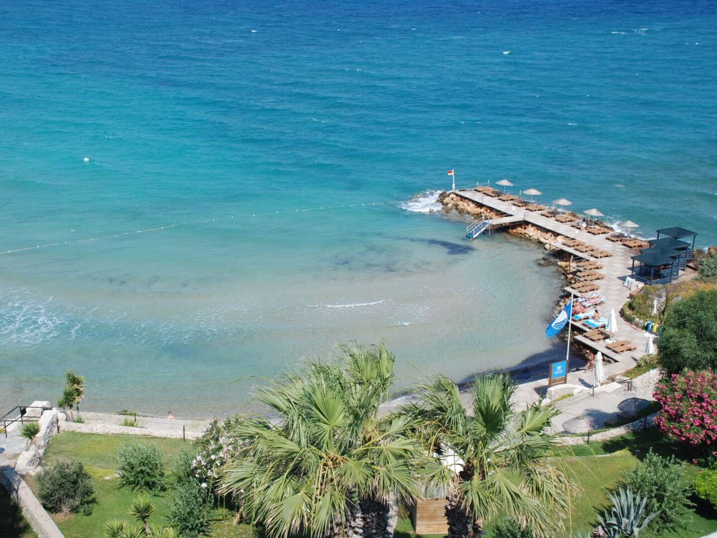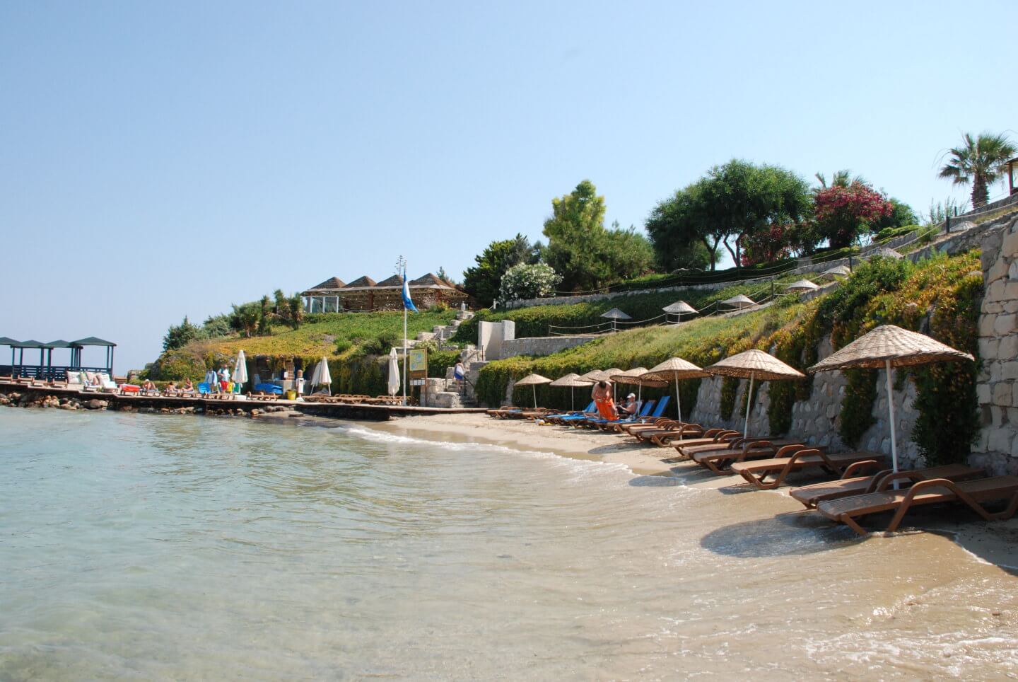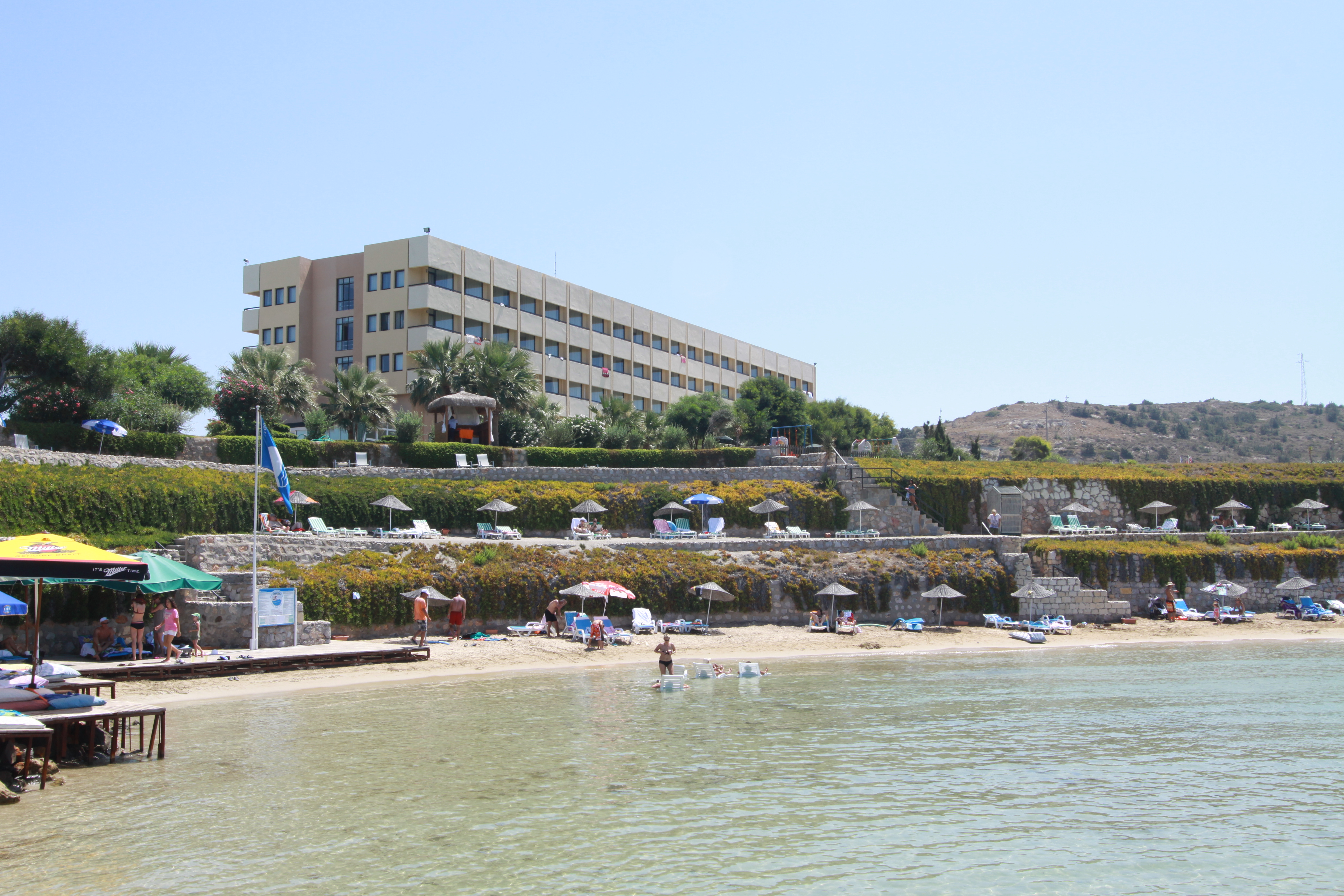 Плаж: дължина на плажната ивица 150 м. Разпределен на 3 нива – първите две нива са с фин пясък, а третото ниво е тревна площ . Морското дъно е с фин пясък плавно полегато. Плажът е удостоен със сертификат „Син флаг“. Има и платформа. Чадъри, шезлонги и матраци на плажа и при басейна- безплатно. Плажни кърпи - безплатно.