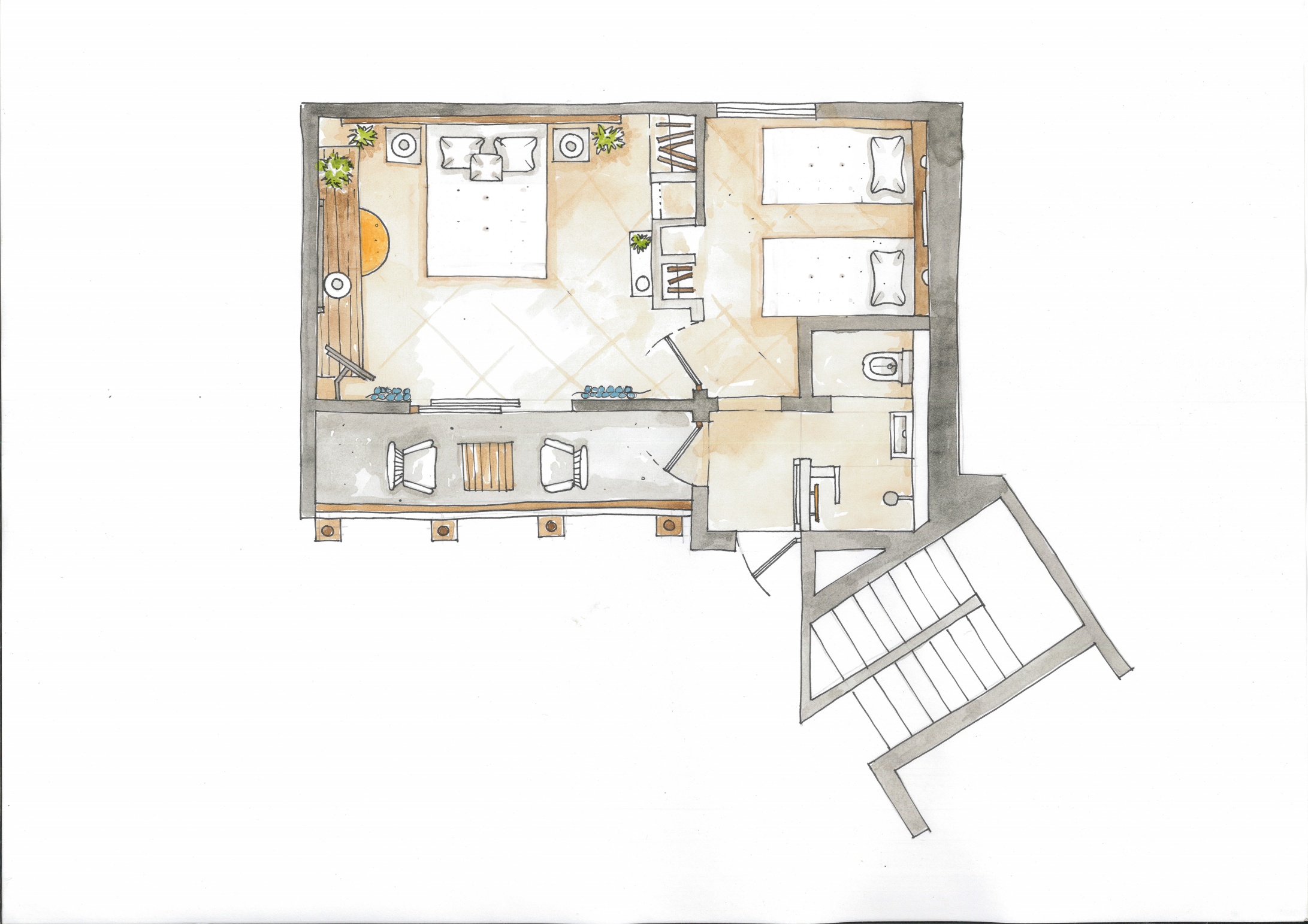 Хотелът разполага с общо 50 стаи, от които 32 Standard room (24 м2), 15 Family room (2 спални, 1 баня - 33 м2). Всички стаи са оборудвани с климатик, телевизор, телефон, баня с душ, сешоар, сет за кафе/чай, мини-бар, сейф. Почистване на стаите и смяна на кърпите - всеки ден, смяна на спалното бельо - 2 пъти седмично. Светли и модерни стаи със свежи оранжеви нюанси, с минималистичен дизайн, предлагащи комфортен престой.