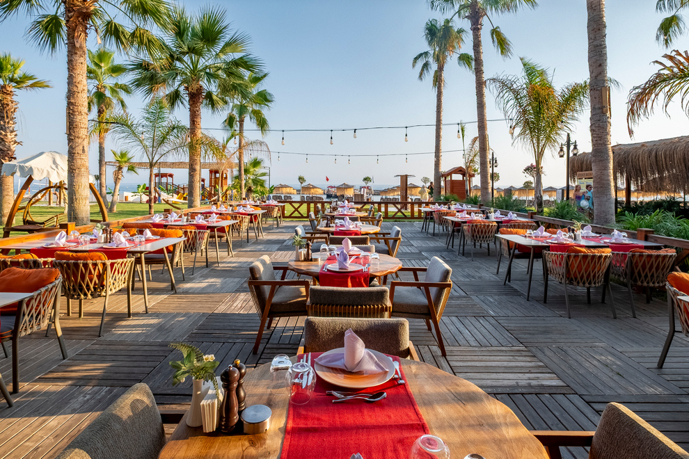 Собствен пясъчно-чакълест плаж с кей на 50 м от хотела. На разположение на гостите има и 2 открити басейна: Main Pool с площ 689 кв.м и дълбочина 140 см, и Relax Pool (+16) с площ 131 кв.м и дълбочина 140 см. Детски басейн с площ 182 кв.м и дълбочина 30 см. 1 вътрешен басейн (отопляем) с площ 44 кв.м и дълбочина 140 см. Мини аквапарк с 3 водни пързалки (без отопление). Шезлонги и чадъри при плажа и басейна се ползват безплатно. Плажни кърпи - срещу депозит.
