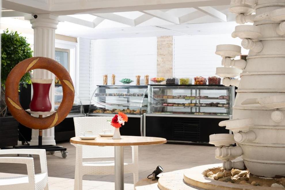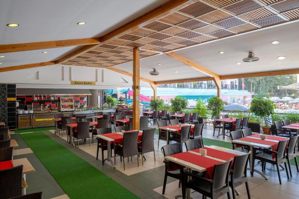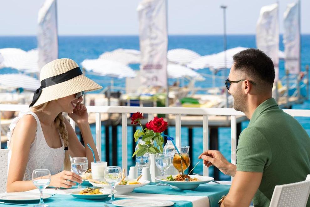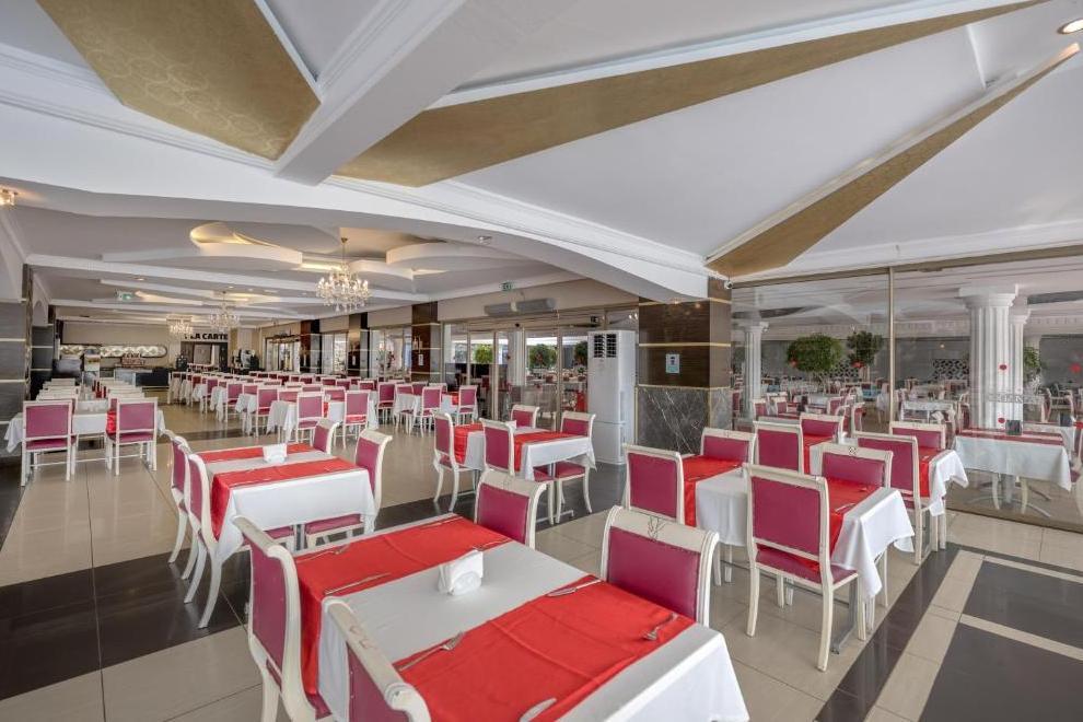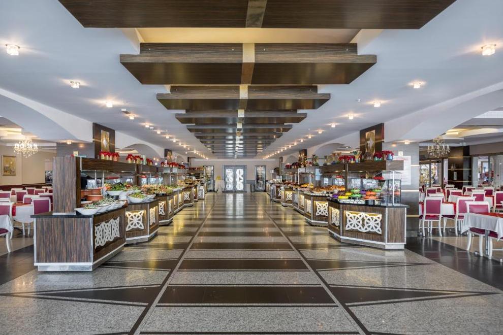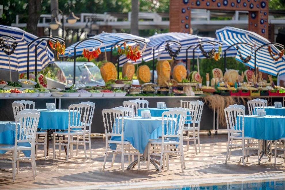 На разположение на гостите е основен ресторант, отворен за закуска, късна закуска, обяд, вечеря и късна вечеря. На плажа се предлагат закуски от 12:30-16:30 ч. Три а`ла карт ресторанта: турски, италиански и рибен. Разнообразни напитки се поднасят в 5 бара: бар при басейна, бар на плажа, Flora Bar - в градината, бар в ресторанта и диско бар.