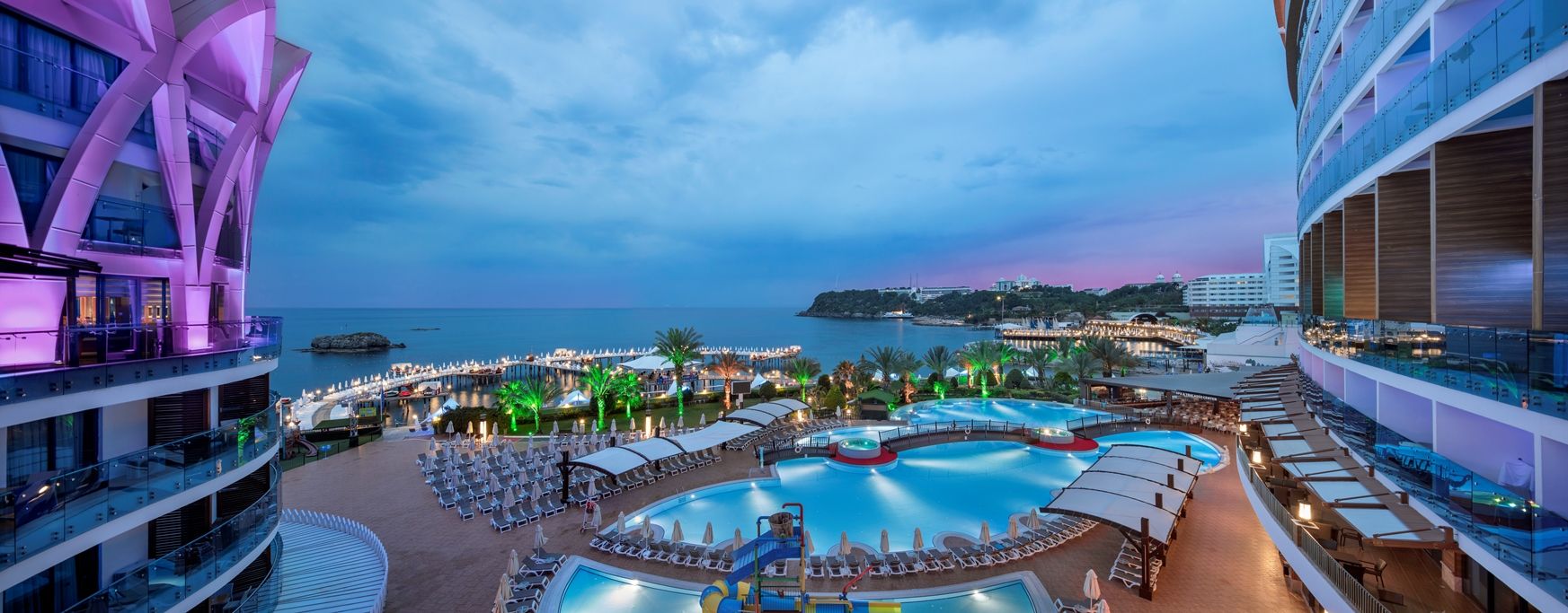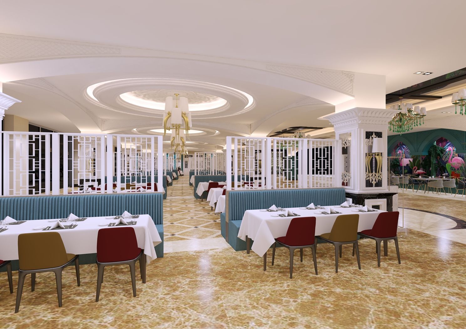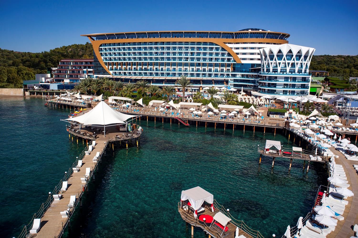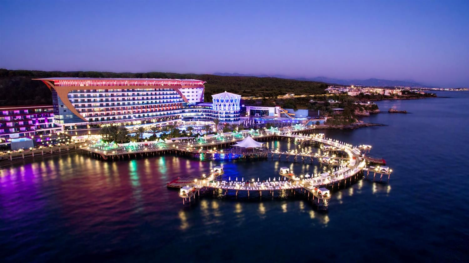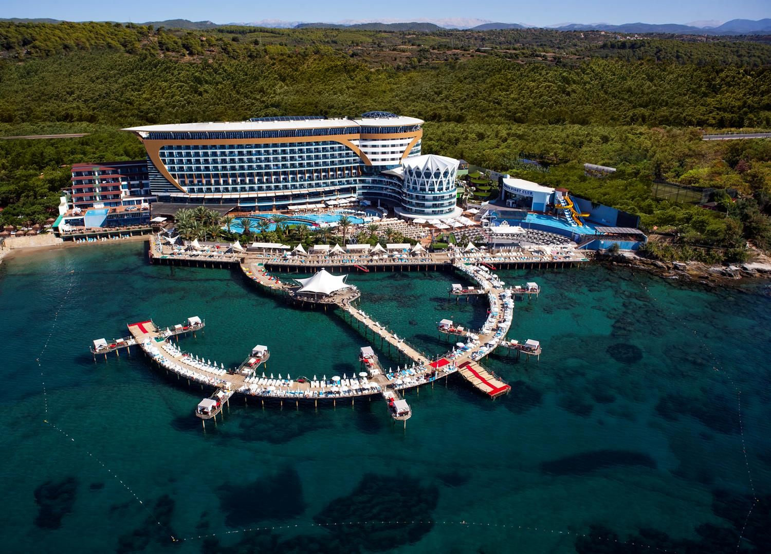 Основен ресторант на отворен бюфет, 4 а ла карт ресторанта, снек ресторант, снек а ла карт ресторант, бургер зона, гьозлеме, гофрети, сладолед, сладкарница, лоби бар, бар на плажа, бар на кея, бар на басейна, диско бар и други 4 бара в общите части на хотела.