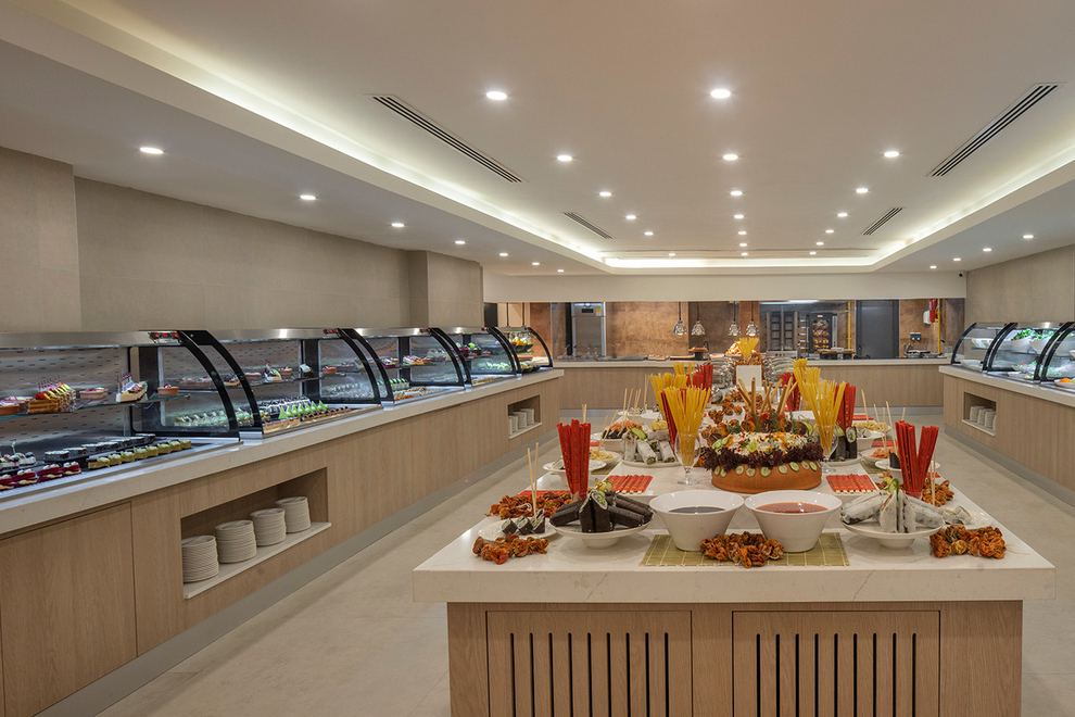 На разположение на гостите има основен ресторант. Освежаващи напитки и закуски се поднасят в сладкарница, лоби бар, лаундж бар, бар при басейна, плажен снек бар. Концепция Ultra All Inclusive – закуска, обяд и вечеря на блок маса, междинни хранения, алкохолни и безалкохолни напитки местно производство и някои вносни напитки – без лимит (съгласно концепцията на хотела).