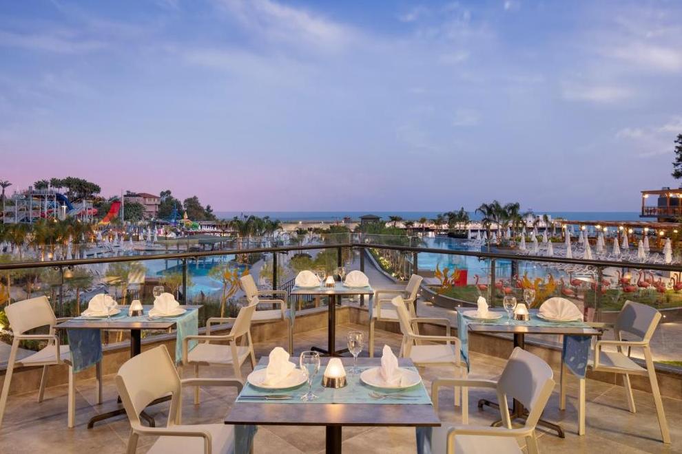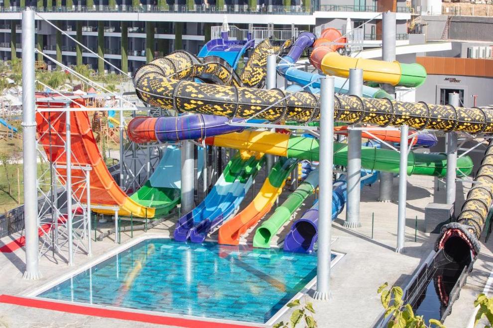 Собствен пясъчен плаж на 50 м от хотела, разположен в залив със спокойно и плитко море. Има и кей с бар. 2 открити басейна, 1 закрит басейн за възрастни, 1 закрит детски басейн, 5 водни пързалки за възрастни и деца. Чадъри, матраци, шезлонги и плажни кърпи на плажа и при басейна се предлагат безплатно. Шатрите се ползват срещу заплащане.