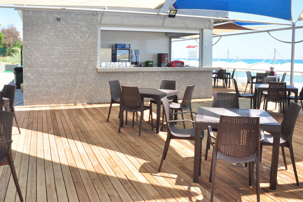 Собствен пясъчно-чакълест плаж, отдалечен на приблизително 250 м от сградата, до който се стига посредством подземен тунел. На разположение на гостите са два външни басейна за възрастни, два външни басейна за деца, два вътрешни басейна (един от които за деца). Чадъри и шезлонги на плажа и при басейна се ползват безплатно. Плажни кърпи – срещу депозит.