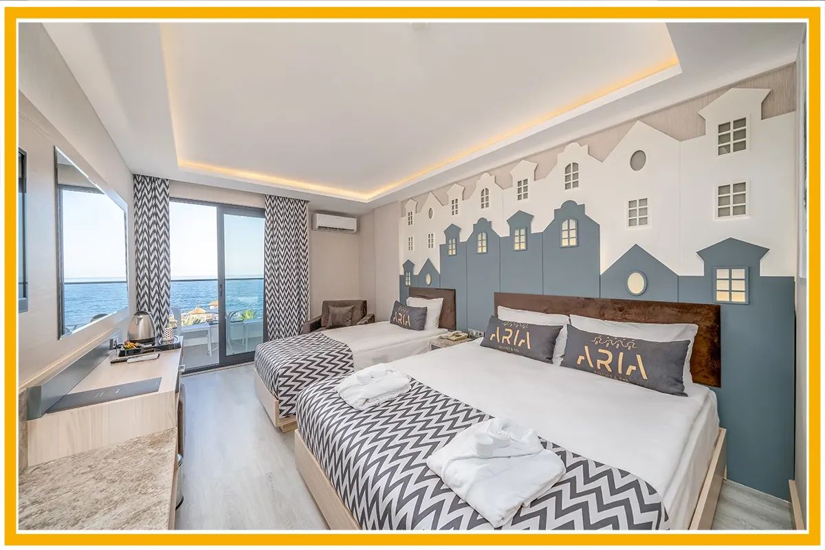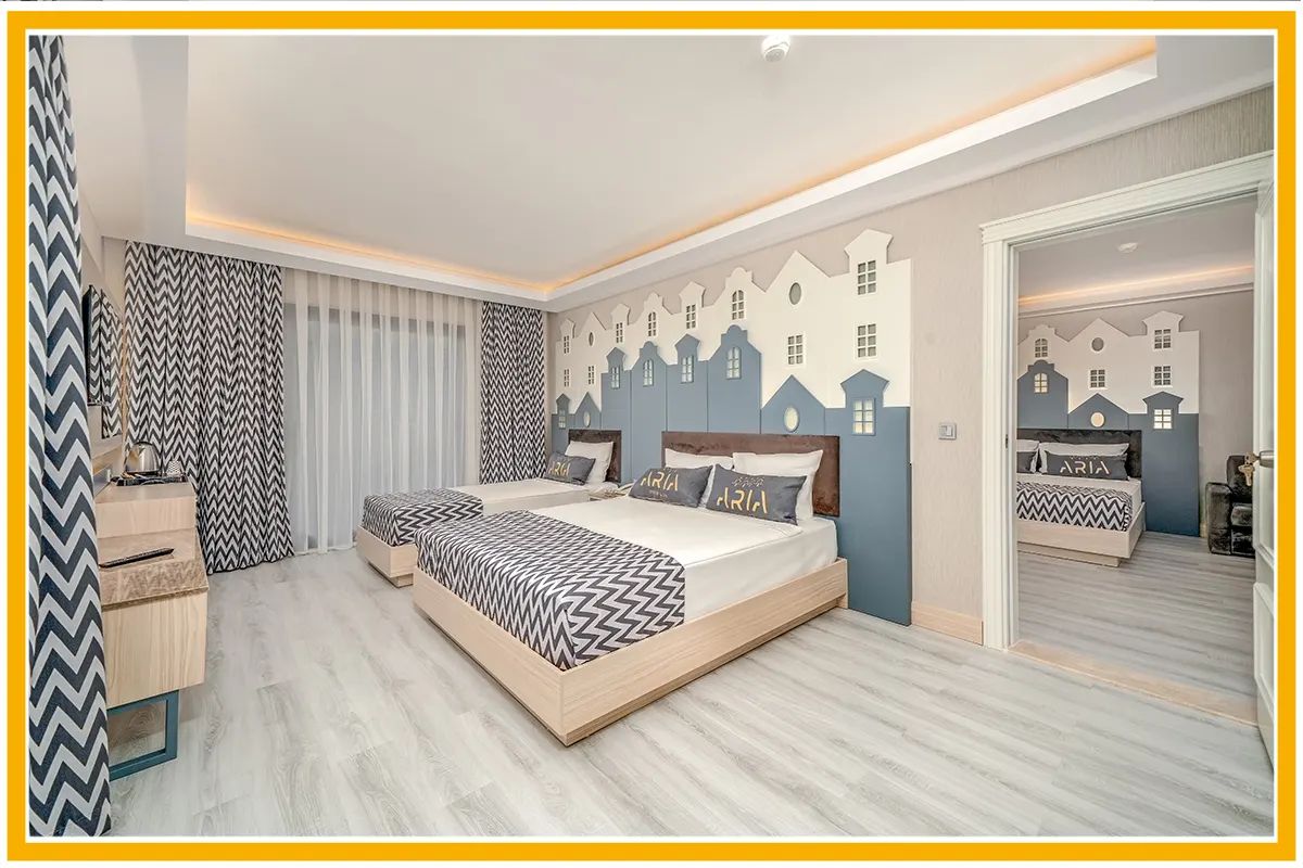 Фамилни стаи с изглед градина (land view) или море. 52 кв. м. Състоят се от две спални.