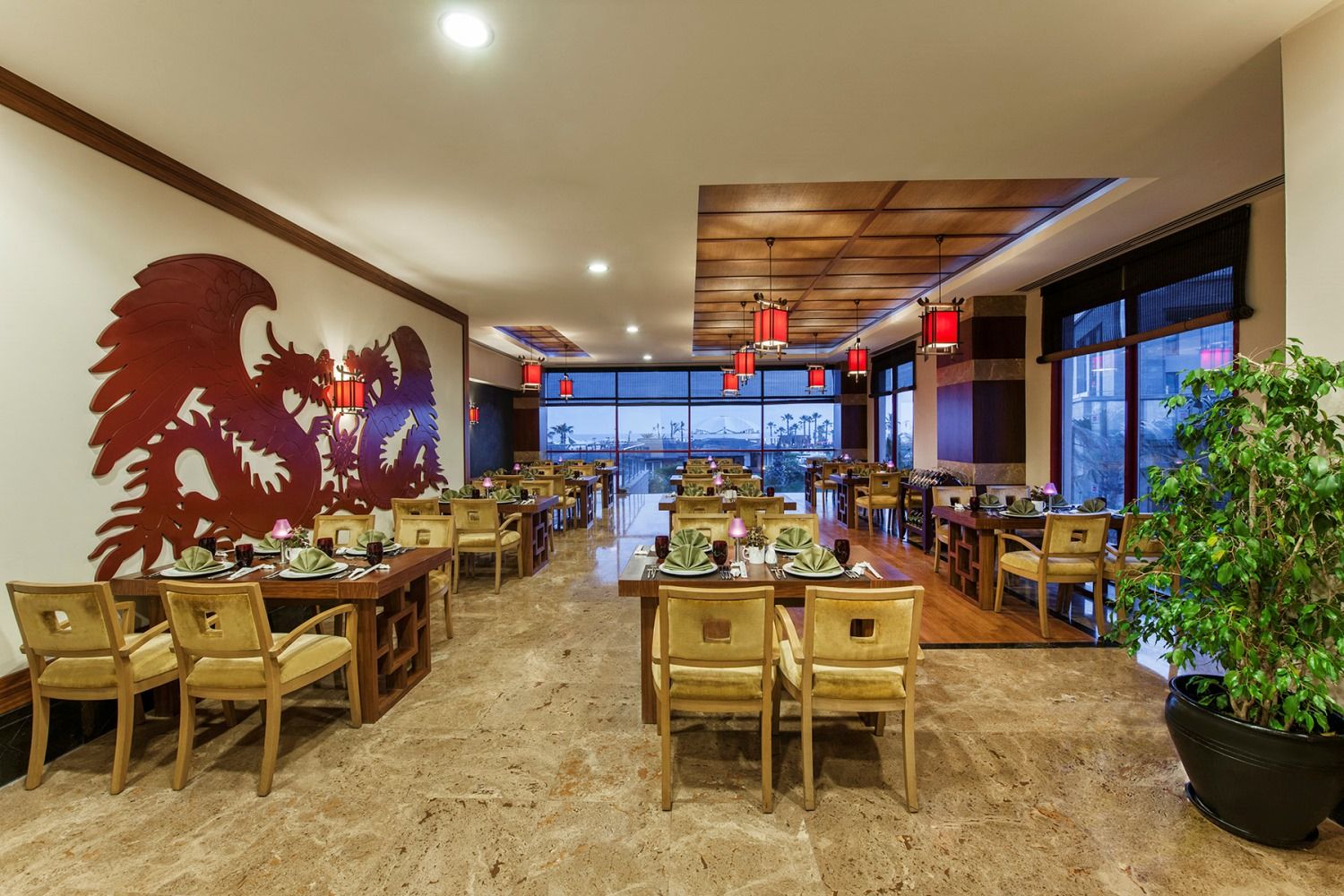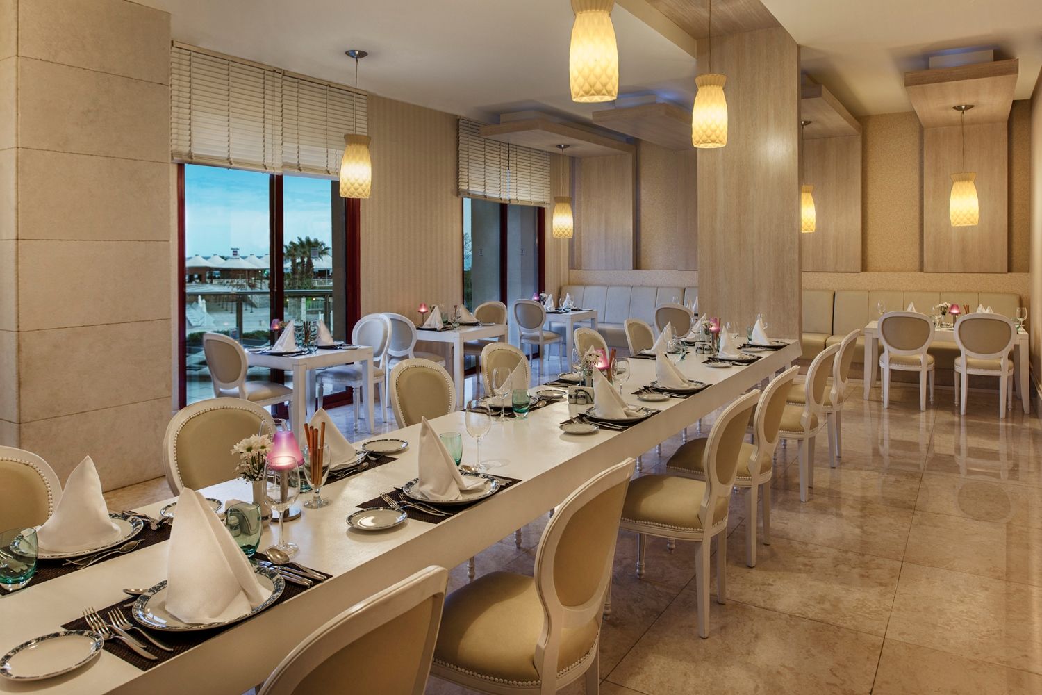 Настаняване на Ultra All Inclusive на отворен бюфет в основен ресторант на хотела. 3 а-ла-карт ресторанта: барбекю, италиански, азиатски. Снек бар, 4 бара.