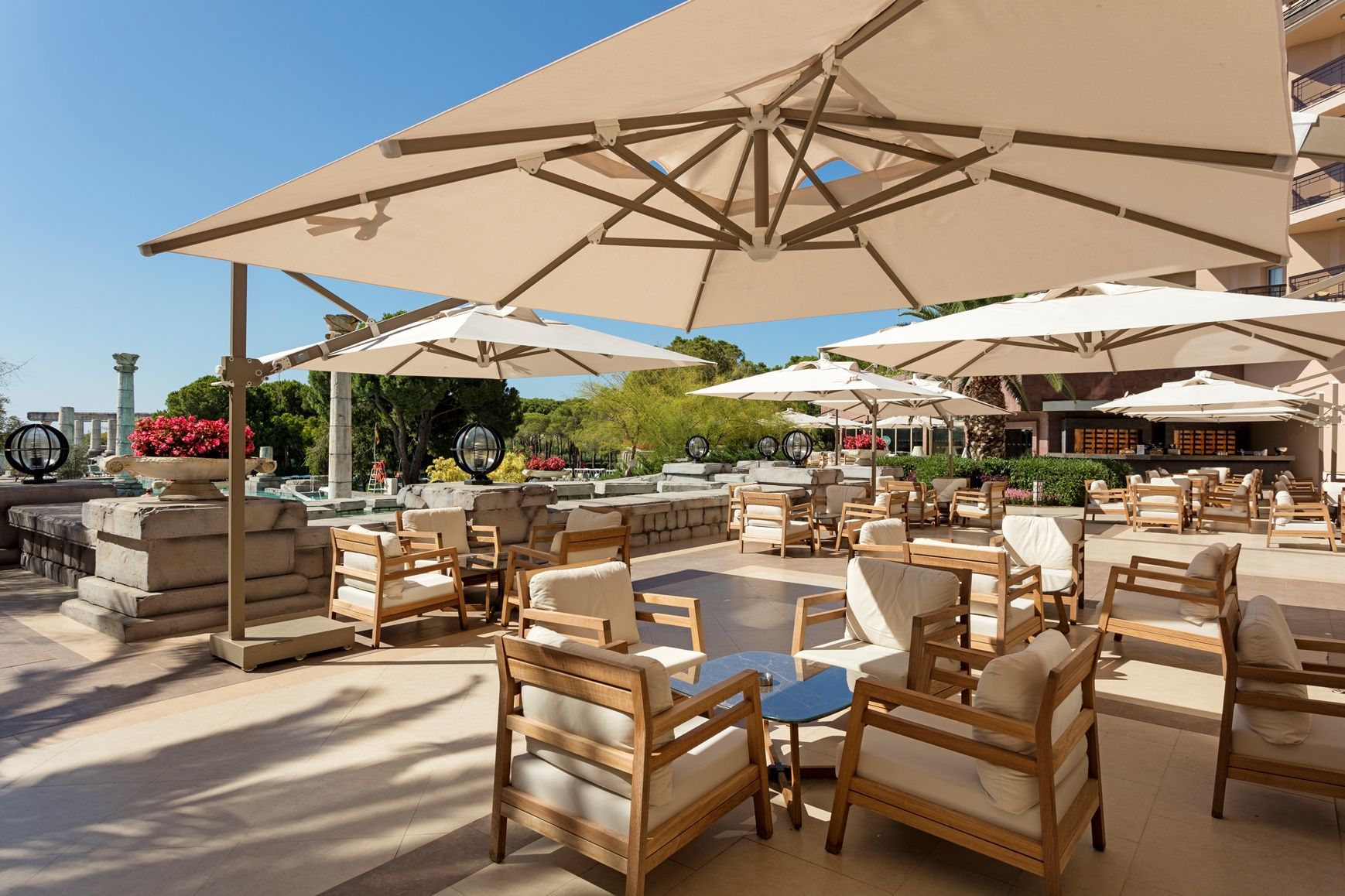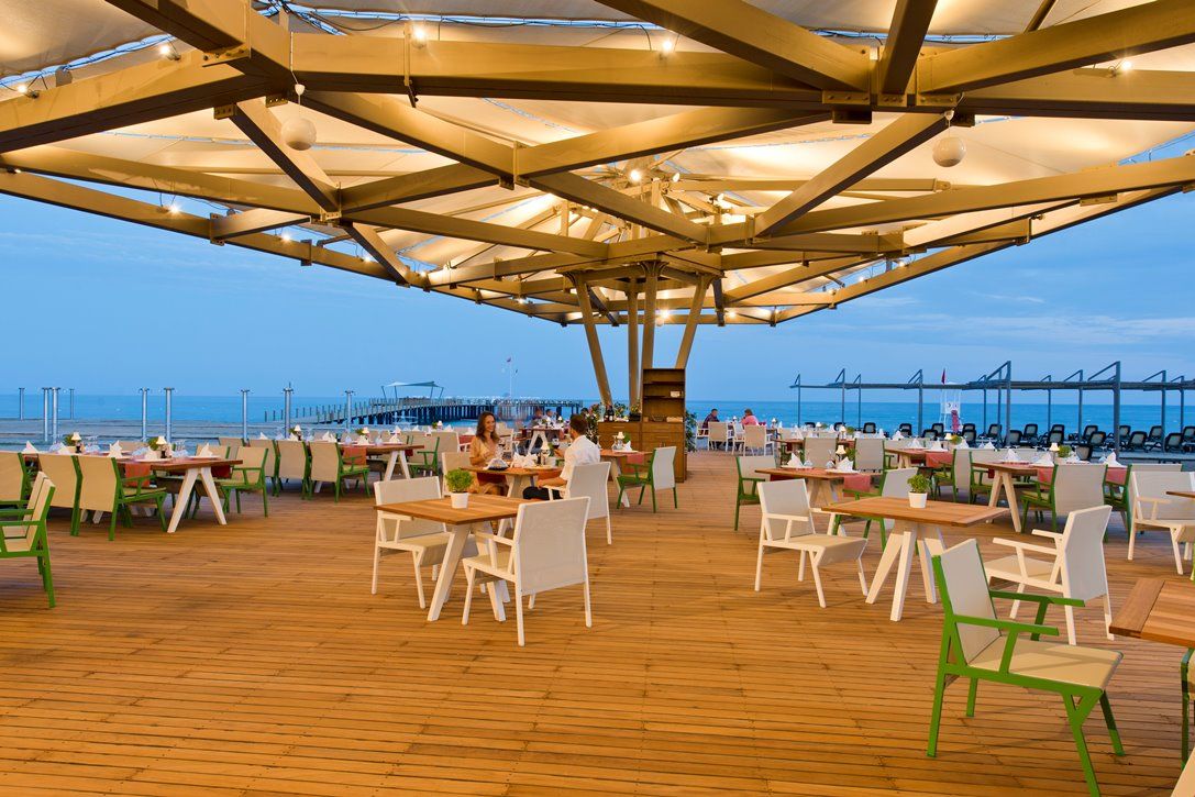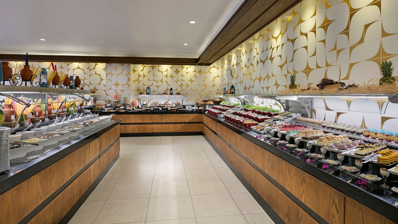 1 основен ресторант на отворен бюфет, 3 а ла карт ресторанта, снек ресторант, сладкарница, лоби бар, бар на плажа, бар на кея, 8 други бара, разположени в общите части по цялата територия на хотела, дискотека на плажа.
