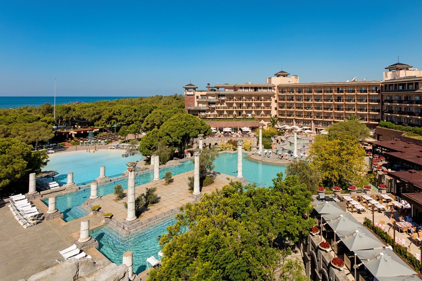 Детско меню в ресторанта, детски басейни, басейн за бебета, мини амфитеатър, детска анимация, специални шоу програми, стена за катерене, приключенски парк, музикално студио, мини диско.