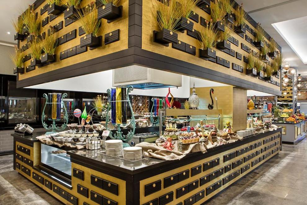 На разположение на гостите са основен ресторант (диетично и вегетарианско меню), 4 а`ла карт ресторанта: Steak House, Azul Felicia Fish, VIP Carat, Turkuaz Turkish (с резервация, платено) и 3 тематични снек ресторанта. Разнообразни напитки и закуски се предлагат в 15 бара и сладкарница.