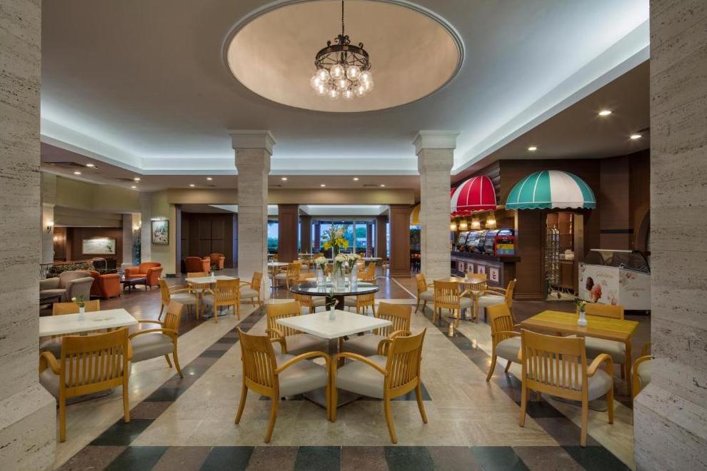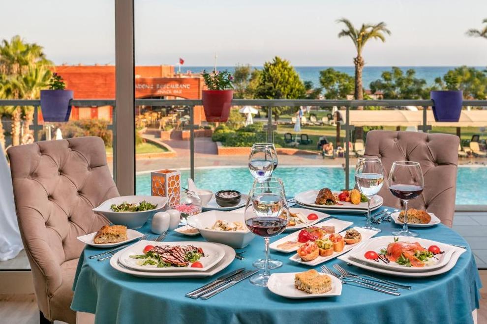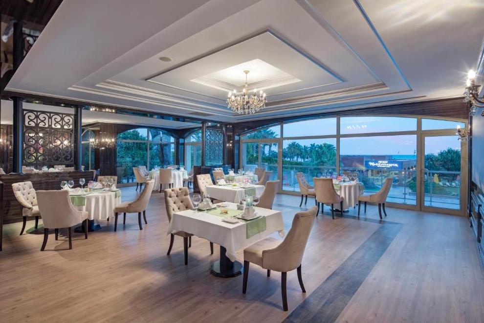 На разположение на гостите са основен ресторант и три а`ла карт ресторанта: турски, средиземноморски и рибен. Освежаващи напитки и закуски се поднасят в 9 бара: Лоби бар - 24 часа в денонощието, Бар на басейна 10:00-18:00 ч., Бар на плажа 10:00-18:00 ч., Бар на аквапарка, Чайна и кафе 10:00-00:00 ч., Ботанически бар 10:00-18:00 ч., Бар Nautilus 10:00-00:00 ч., Ирландски бар 16:00-01:00 ч., Диско бар 22:30-02:00 ч.