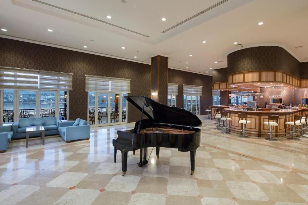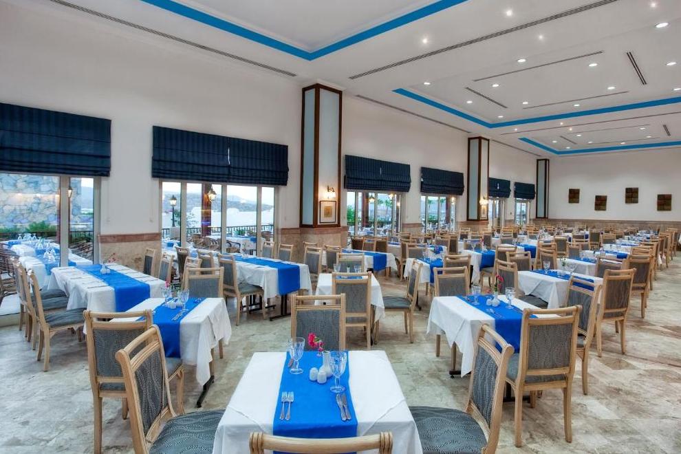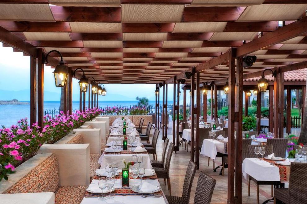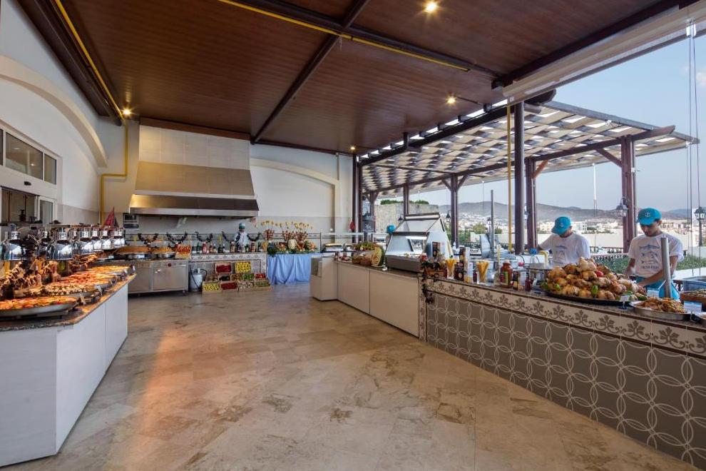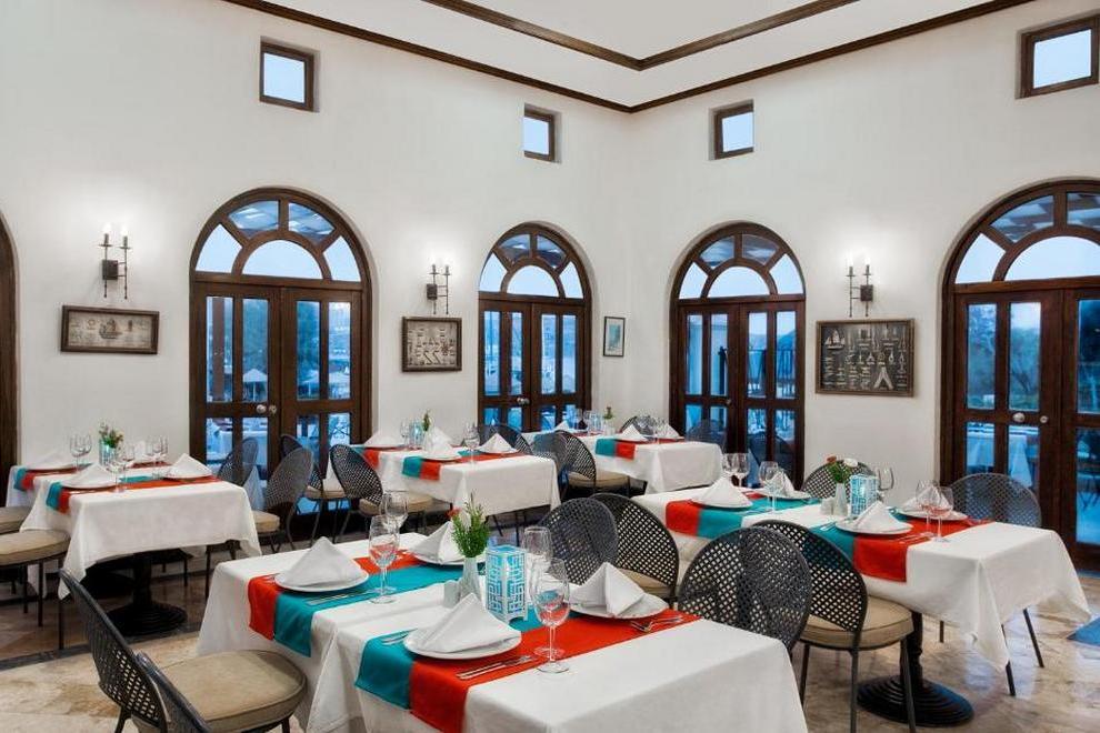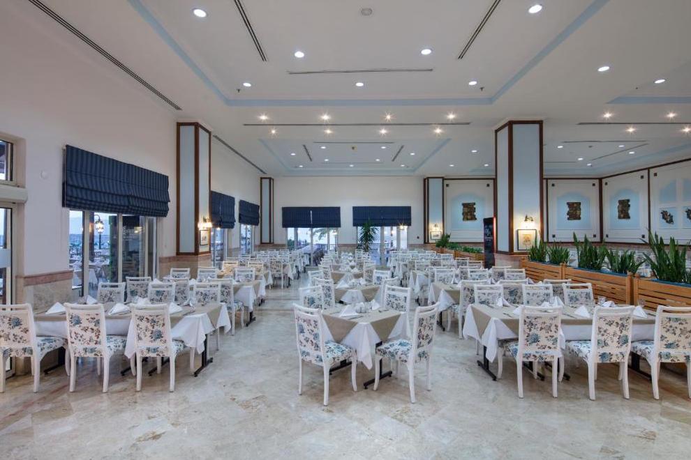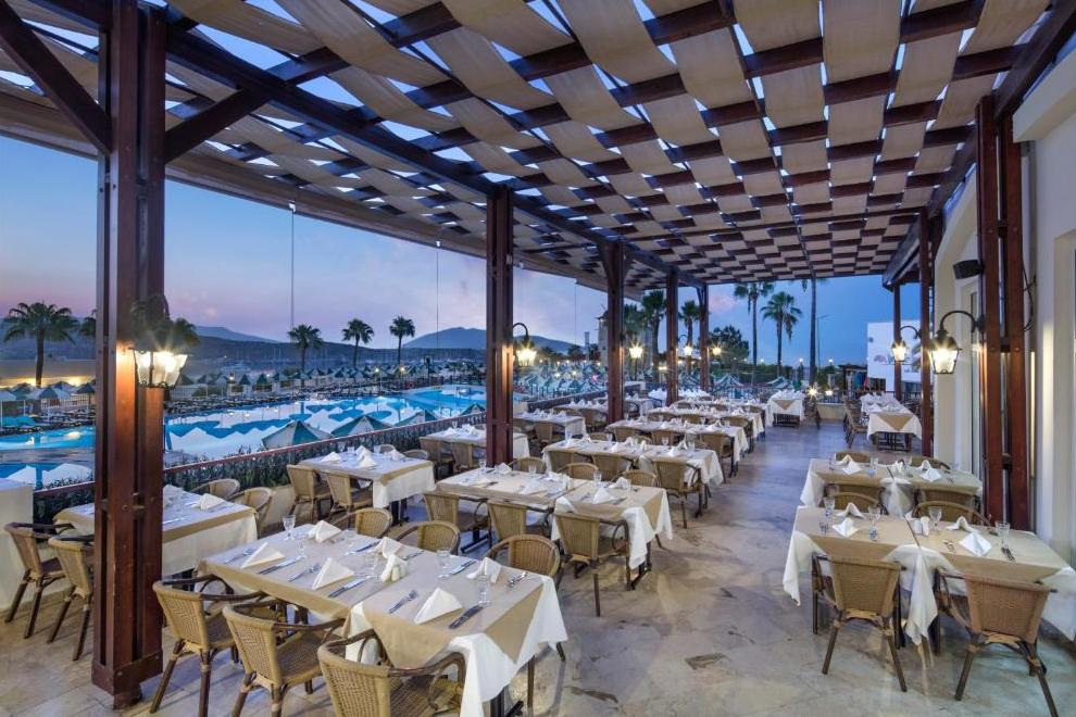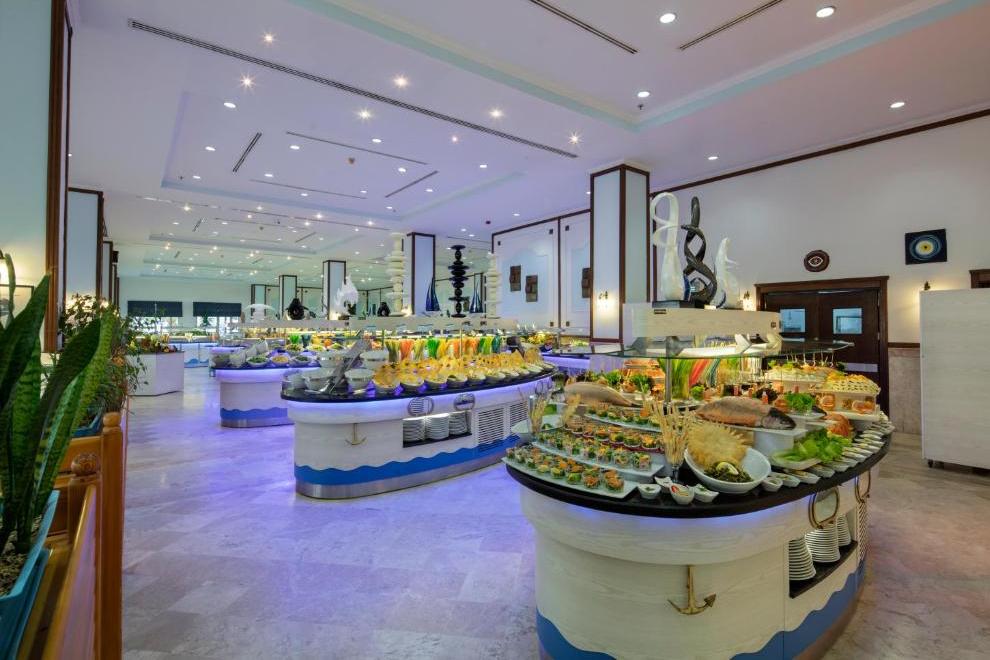 Хотелът има основен ресторант и 4 а`ла карт ресторанта: рибен - Harbour Sea & Salt Fish, италиански - Primavio и турски - Tabla Kebap (с предварителна резервация - 1 безплатно посещение при престой повече от 5 нощувки), ресторант 7/24 - интернационална кухня (не е необходима резервация и работи денонощно). Освежаващи напитки и закуски се поднасят в 7 бара: бар при басейна, бар на плажа, бар при мелницата, релакс бар, диско бар, лоби бар, денонощен бар, сладкарница.