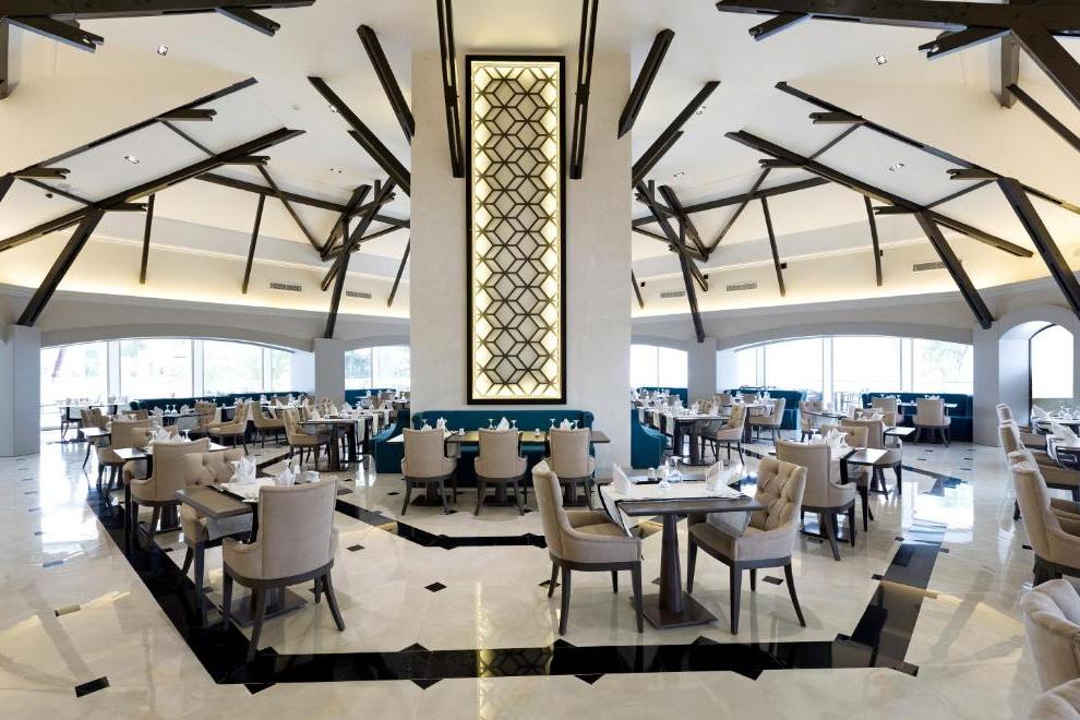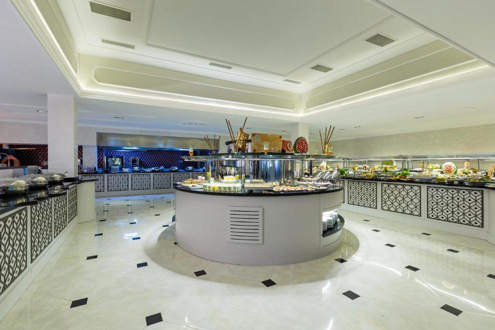 Хотелът разполага с основен ресторант, 2 а`ла карт ресторанта - рибен и турски (с предварителна резервация). Lobby Bar – работи денонощно, Бар при басейна 10:00-00:30 ч.; Lunch бар 10:00-00:30 ч.; Laduree 12:00-17:30 ч.; Снек бар 12:00-17:00 ч.; Бар на плажа 09:00-18:30 ч., (безалкохолни напитки, бира, вино); Диско бар 23:00-02:00 ч. База на изхранване UAI включва закуска, обяд и вечеря на шведска маса, междинни хранения, местни алкохолни и безалкохолни напитки - без лимит (24 часа).