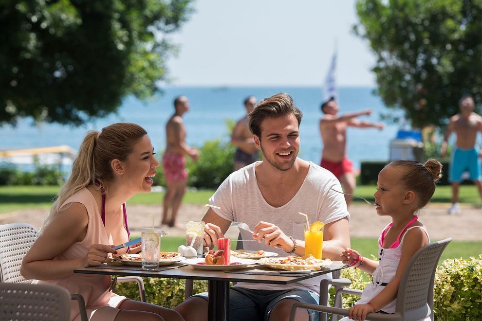 На разположение на гостите има основен ресторант, 4 а`ла карт ресторанта (азиатски, италиански, турски и морски), 4 бара. Ultra All Inclusive– закуска, обяд, вечеря и междинни хранения на блок маса, местни и някои вносни алкохолни и безалкохолни напитки - без лимит.