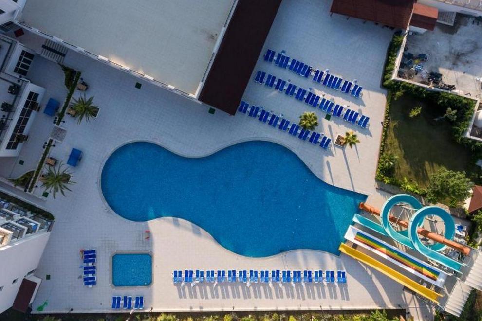 Хотелът има собствен пясъчно-чакълест плаж и 2 открити басейна с 4 водни пързалки.