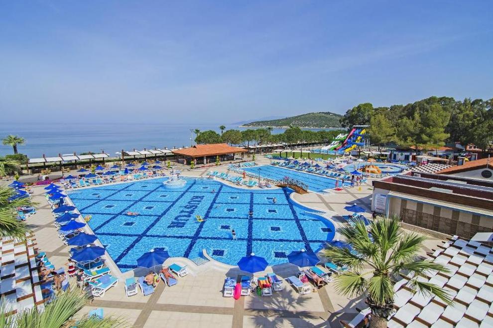 Kustur Club Holiday Village се намира на 130 км от летище "Милас", на 3 км от центъра на Кушадасъ, на огромна зелена територия, на брега на морето. Препоръчва се за семеен отдих.