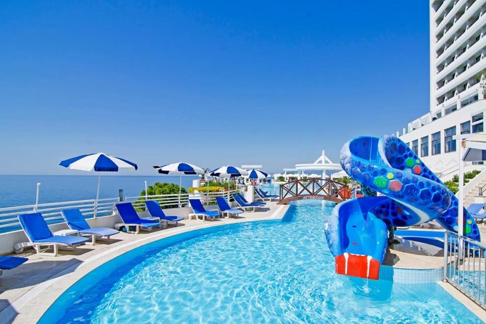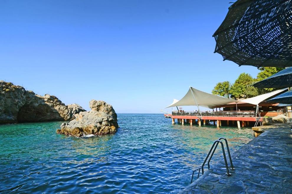 Собствен пясъчно-чакълест плаж, дълъг 50 м и платформа, разположени в красим малък залив. На разположение на гостите са 1 открит басейн със сладка вода, неотопляем, 700 кв.м, отворен от 08:00-20:00 ч. 1 закрит басейн със сладка вода, 45 кв.м, отворен от 09:00-20:00 ч. 1 водна пързалка за деца от 3 до 10 години, неотопляема, отворена от 11:00-14:30 ч. Чадъри, шезлонги, матраци, хавлии на плажа и при басейна се предоставят безплатно.