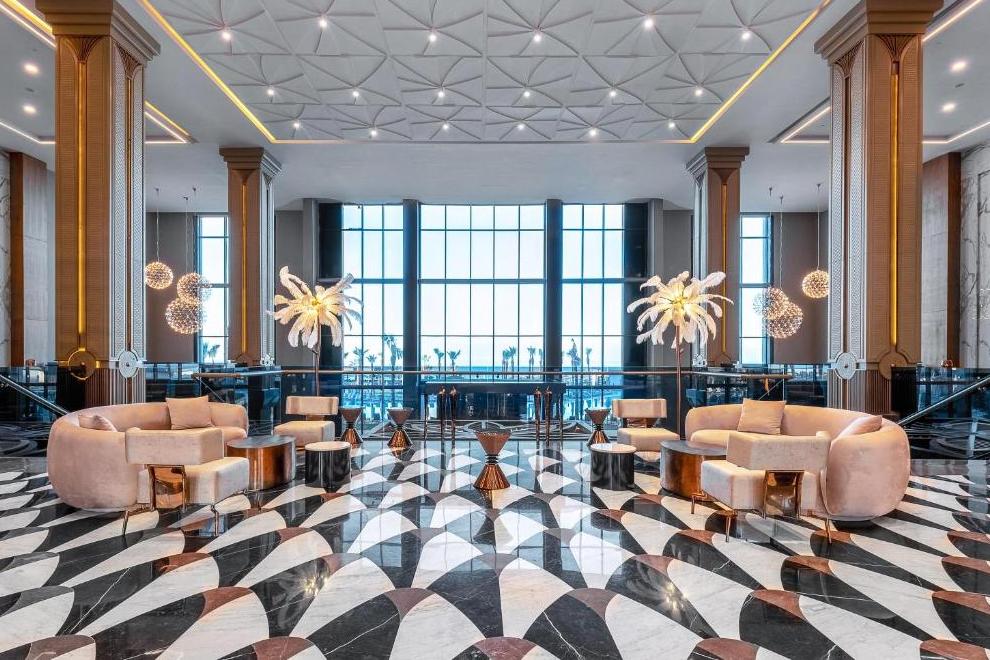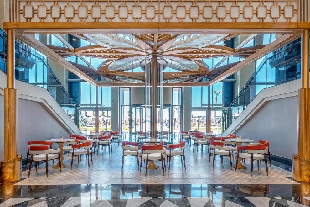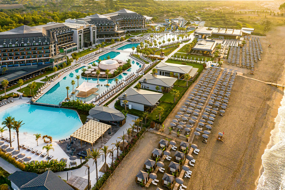 Собствен пясъчно-чакълест плаж, дълъг 350 м, с кей и плажни барове. За удобство на гостите предлага също основен басейн с площ 2000 кв.м, релакс басейн с площ 900 кв.м, Maldiva Pool само за възрастни (16+) с площ 820 кв.м, Infinity Pool с площ 280 кв.м, Indoor Pools, Aquapark Pool, Mega Aquapark Pool, Maldiva Kids Pool и Kids’ Aquapark Pool с 5 пързалки. Чадъри, шезлонги, матраци и плажни кърпи на плажа и при басейните се предоставят безплатно.