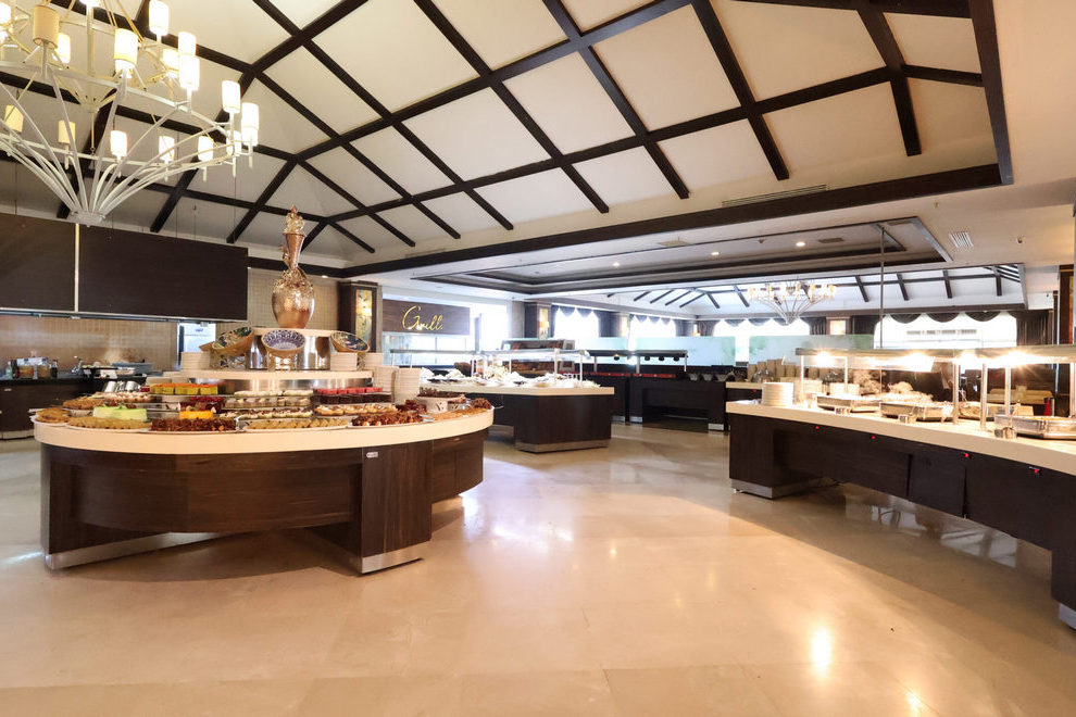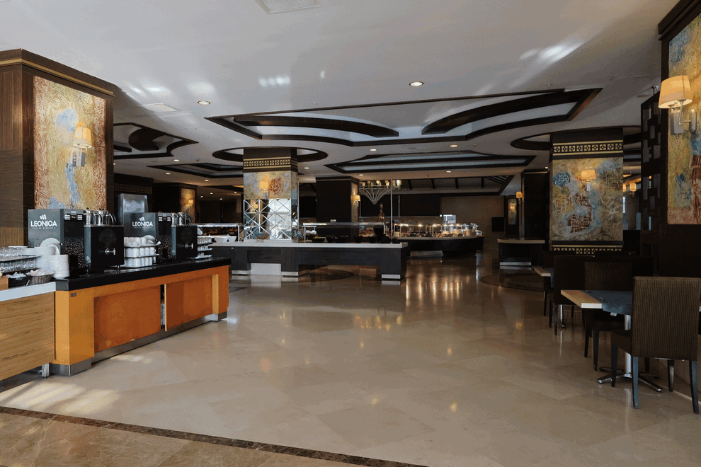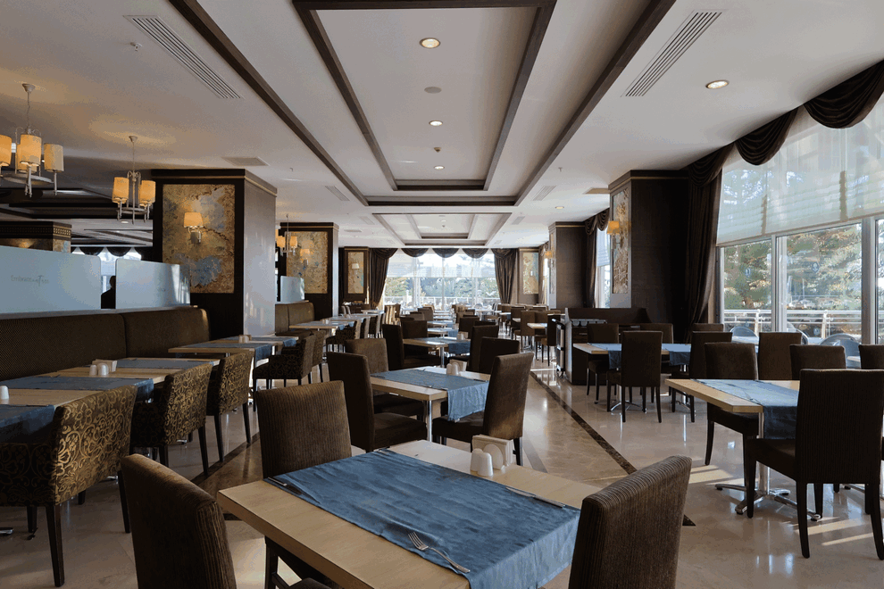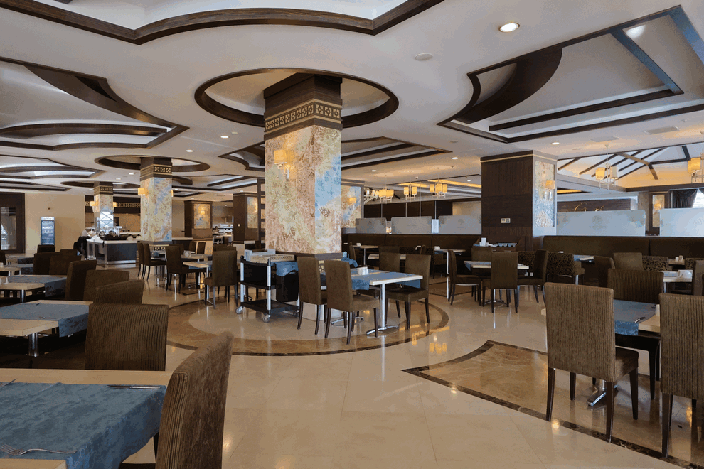 Хотелът разполага с основен ресторант, където поднася закуска, късна закуска, обяд, вечеря, (детско и диетично меню) и нощна супа. Капацитет на затворената зона: 700 души, на терасата - 400 души. Османска, италианска, китайска и рибна кухня се поднасят в а'ла карт ресторантите на хотела. Всеки а'ла карт ресторант може да се използва безплатно веднъж седмично, при условие, че се направи предварителна резервация. Османският ресторант е с капацитет 65 души; капацитет на италианския ресторант - 45 души; капацитет на китайския ресторант - 60 души; капацитет на рибния ресторант - 60 души (01 юни - 30 септември). В сладкарницата се поднасят чай и кафе и вкусни сладкиши и бисквитки в определени часове, всеки ден. Барове: лоби бар, снек-бар, бар на басейна, бар на плажа, Game Bar, диско бар (платен), витамин бар (платен).