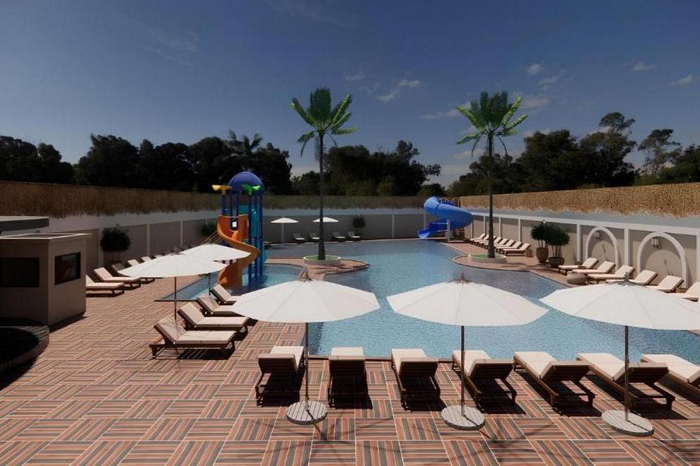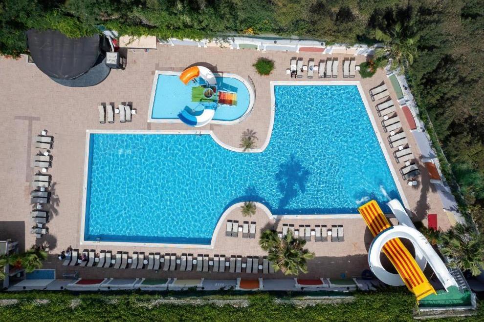 Собствен пясъчен плаж на 550 м от хотела. Открит басейн за възрастни: 500 кв.м, детски басейн 55 кв.м и две водни пързалки - по една за възрастни и деца.