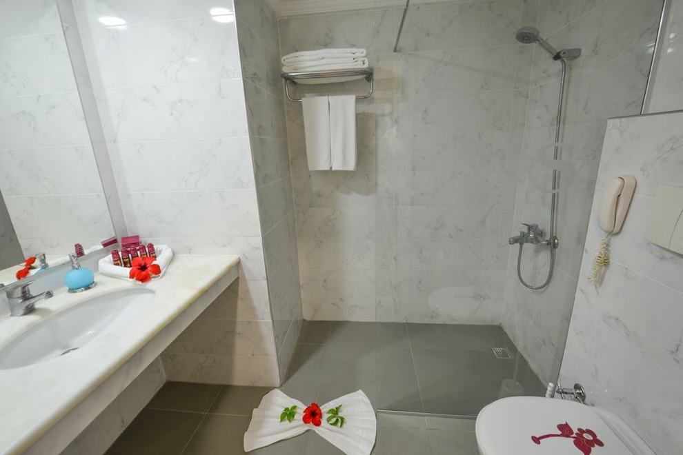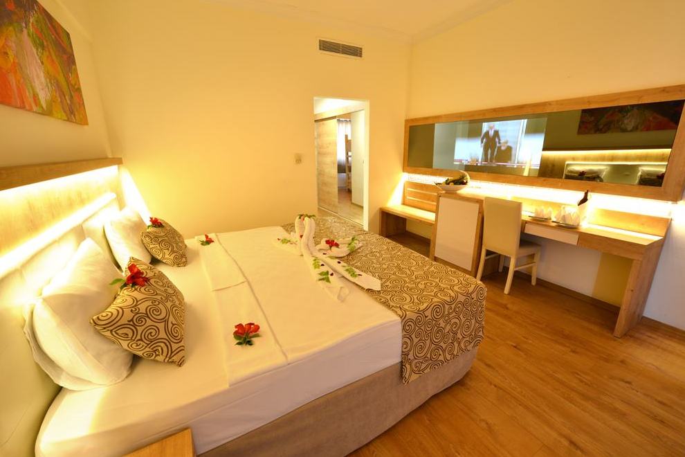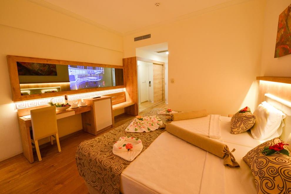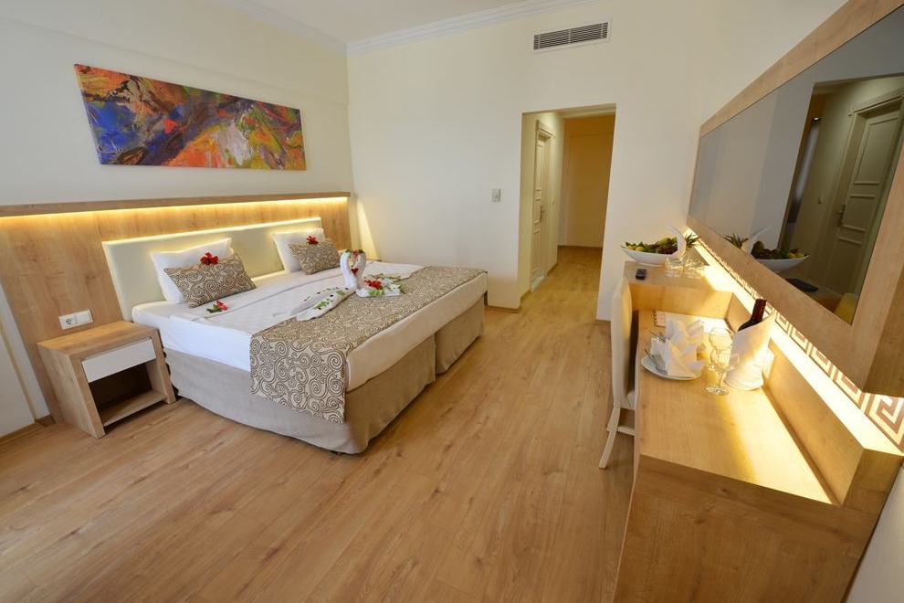 Хотелът се състои от една основна 5-етажна сграда и един 5-етажен корпус Anex, намиращ се през пътя. Посреща гостите си в 326 standard rooms (макс. 3 чов., 24 кв.м); 50 едностайни family rooms (2 големи стаи без врата, със спалня, макс. 4 чов., 30 кв.м; Palm: 321 standard pool side rooms (макс. 3 чов., 24 кв.м). В стаите има централен климатик, безплатен Wi-Fi, сейф, телевизор, минибар, телефон, самостоятелна баня с душ, сешоар, балкон. Стаите се почистват три пъти седмично. Смяна на спалното бельо – три пъти седмично.