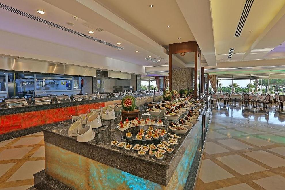 На разположение на гостите са основен ресторант и 4 а`ла карт ресторанта: турски, италиански, азиатски, морски. Освежаващи напитки и закуски се поднасят в лоби бар, ирландски пъб, диско, бар до басейна и плажа.