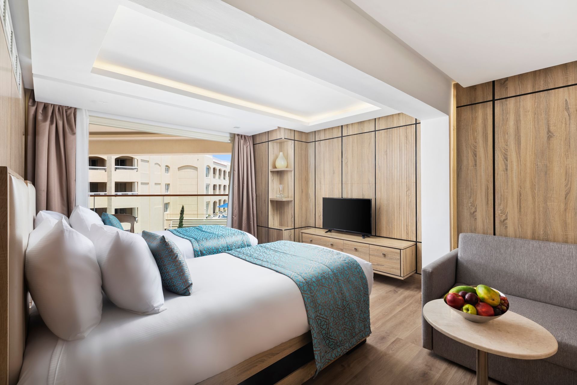 Хотелът разполага с общо 678 стаи, разположени в комплекс от двуетажни вили, основна четириетажна сграда и триетажен корпус. от които 374 Standart rooms (с изглед към градина, басейн или морето – 24 м2), 220 Standard bungalow rooms (с изглед към градина или море – 28 м2), 62 Family rooms (с изглед към градина, басейн или морето) и 22 Suites (с изглед към морето). Всички стаи са оборудвани с климатик, телевизор, телефон, баня с душ, сешоар, минибар (зарежда се всеки ден с минерална вода - безплатно), сет за чай/кафе, сейф, Wi-fi, балкон. Почистване на стаите и смяна на кърпите - всеки ден, смяна на спално бельо – 3 пъти в седмицата.