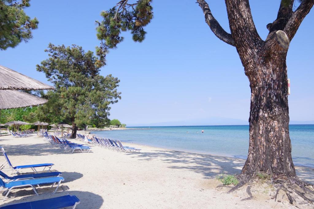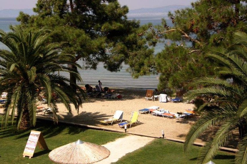 Собствен пясъчен плаж пред хотела, с включени чадъри и шезлонги.